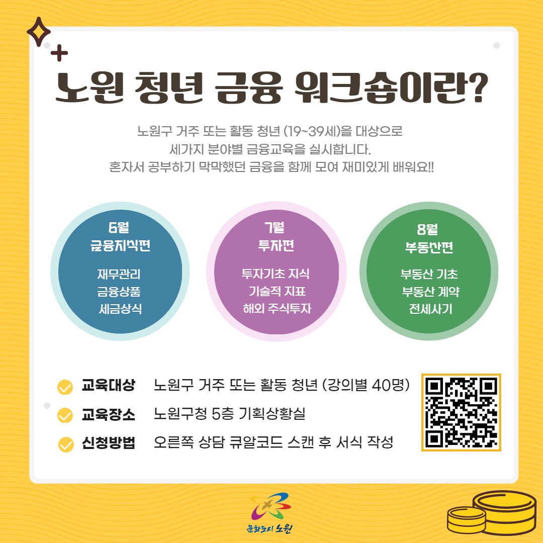 🏧💸이번 달도 통장 잔고 0원이신가요? ‘내 월급 어디 갔지?, 요즘 같은 시대에 전세 계약 무섭지 않아요?, 투자? 그건 돈 있는 사람들이나 하는 거 아냐?’ 이런 생각 한 번쯤 해보셨죠? 누가 가르쳐준 적도 없는데, 하루아침에 어른이 되어 버린 우리. 월세, 공과금, 생활비, 그리고 가끔 불쑥 나가는 병원비까지… 뭔가 계속 빠져나가기만 하는데, 돈과 친해지는 법은 도무지 모르겠고요. 이런 상황 속에서 ‘어떻게 살아야 하나…’ 고민하는 청년들을 위해, 노원구가 준비했습니다. 바로 “청년 금융 워크숍”이라는 금융 클래스를요. 워크숍이라 주저하는 당신께 감히 말씀드립니다. 일단 들어보시면 진짜 실속 있는 생존 전략 금융 클래스라고 느끼실거에요. 실속있는 강좌와 각자 고민을 가지고 있는 청년이 만나 소통도 하는 자리이니, 관심 있으신 분들 여기로 집중해주세요.✨ |
