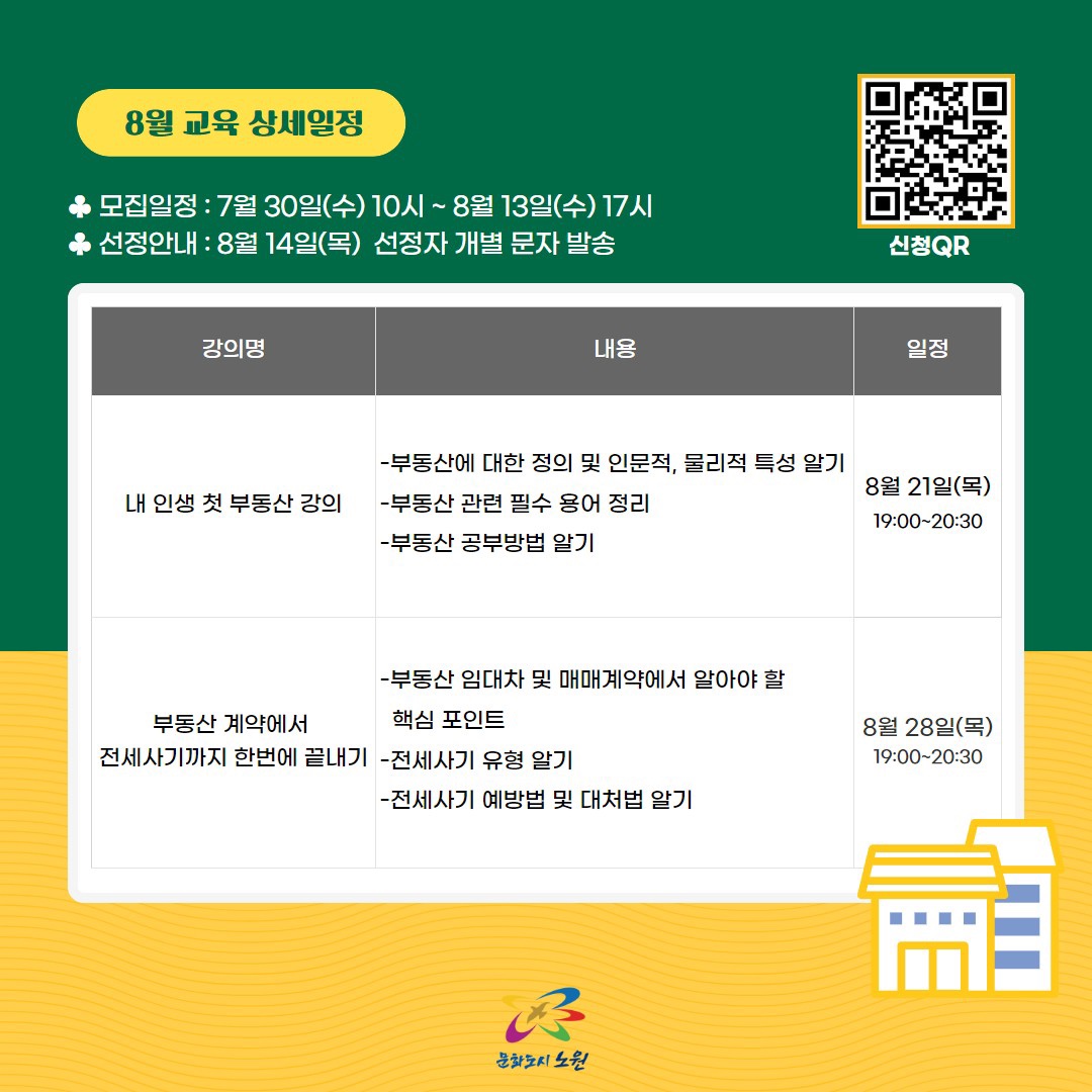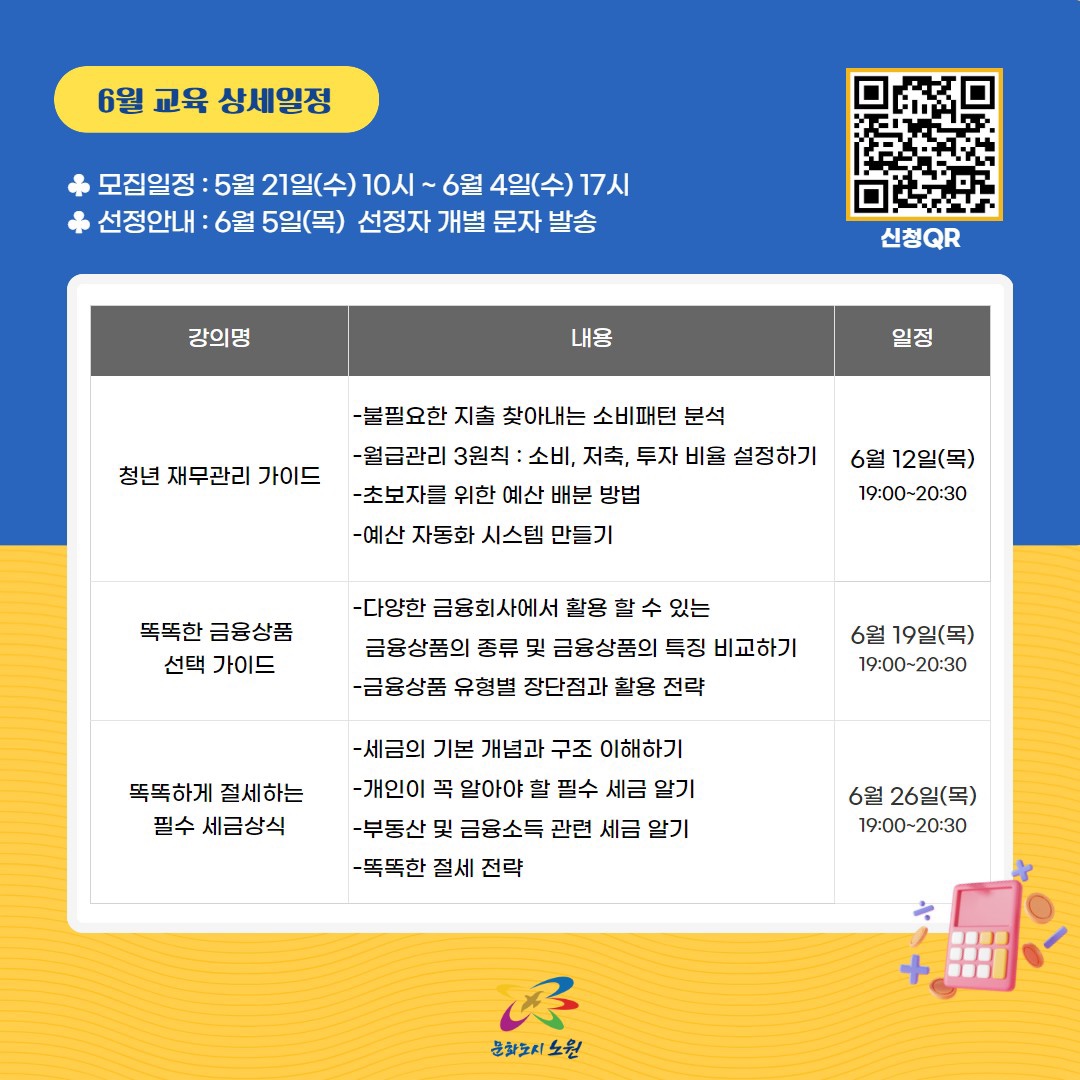 쉽게 말해, 우리가 지금 가장 궁금해하고 필요한 금융 정보만 쏙쏙 뽑아서 알려주는 프로그램이에요. 재무관리부터 전세사기 예방까지요! 투자, 신용, 부동산, 절세 팁까지 일상 속 놓치면 안되는 부분까지 다 가능합니다. 6월부터 8월까지 총 8번의 강의는 노원구청에서 진행됩니다. 특히, 요즘 사회적 이슈로 떠오른 ‘전세사기’, 어떻게 하면 내 돈을 지킬 수 있는지, 또 어떤 금융상품이 나한테 맞을지, 헷갈리는 ‘세금’은 어떻게 절약하는지까지… 하나하나 쉽게, 그리고 현실적으로 알려드릴 거예요.🤔🤑 |
